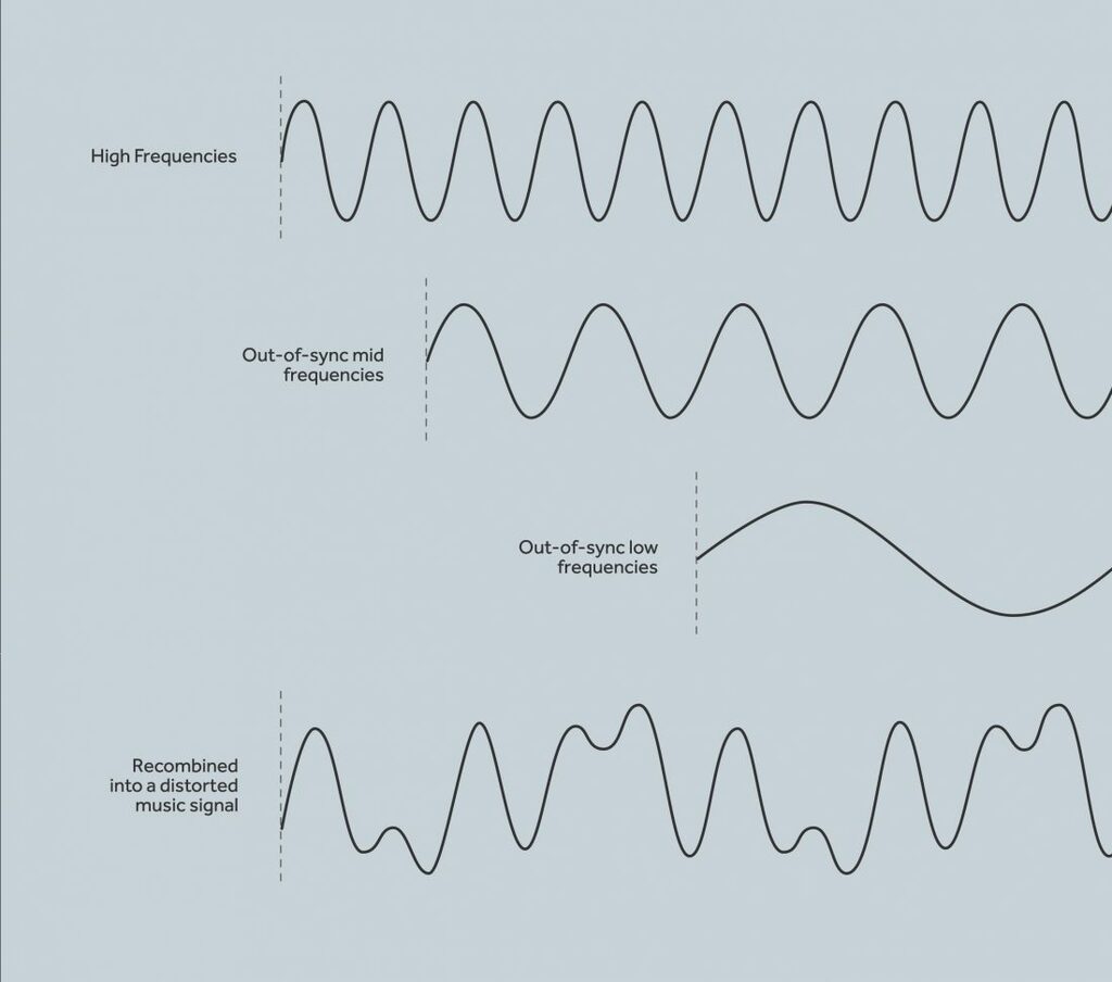 The lower the frequency, the more it’s delayed as it passes through the crossover. This means the different frequencies that make up each note are no longer synchronised. When the music is recombined, it’s a flawed version of the original and the instruments are distorted.