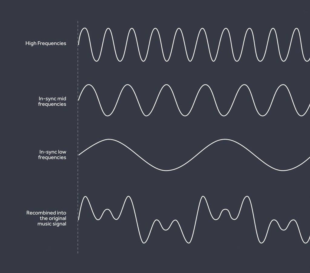When you hear an instrument being played live, the elements that make up every note — including all the harmonics — arrive at your ear at the same time.