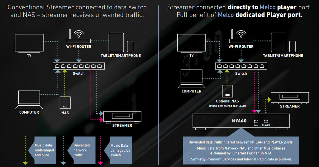 Unlike PC based systems, all Melco's have a dedicated PLAYER port. This allows connection directly to the network Streamer or Player without any data switch in the signal path which would damage the music data.